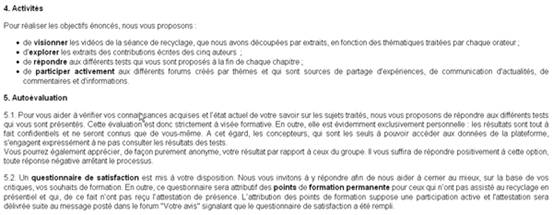 Dans cette partie, le participant peut trouver des informations sur les objectifs du cours ainsi que sur la façon d'y intervenir : tests, forums, questionnaire de satisfaction.