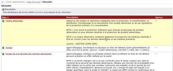 Dans cette partie, le participant a accès à une liste alphabétique des termes relatifs à ce cours, accompagnés de leur description.