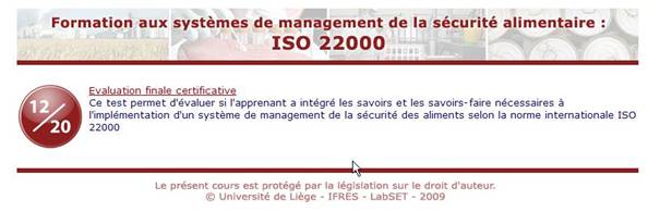 Ce test permet aux enseignants d'évaluer si le participant a intégré les savoirs et savoir-faire nécessaires à l'implémentation d'un système de management de la sécurité des aliments selon la norme internationale Iso 22000. Il est accessible en fin de formation.