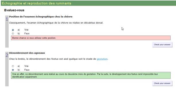 Des petits tests sont présents au terme de certains chapitres du cours. Les feedbacks sont immédiats et doivent aider l'apprenant à bien comprendre quelle est la bonne réponse et pourquoi. Il n'y a pas de score, l'objectif est surtout de s'entraîner.