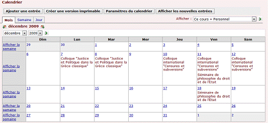 Dans cet espace en ligne, le calendrier est utilisé pour informer étudiants et chercheurs des activités départementales officielles, tel que les conférences, les colloques, les journées d'étude ou tout autre activité susceptible d'intéresser les différents membres du département. Ces activités sont répertoriées dans le calendrier et visibles par tous. En cliquant sur une entrée du calendrier, on trouvera le thème de l'activité, la date, l'heure, le lieu et parfois une brève description ou une URL.