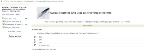 Ainsi, l'apprenant a la possibilité de se tester régulièrement et de vérifier s'il a bien intégré les concepts liés aux problématiques de l'environnement et du développement. Les feedbacks sont, certes, automatisés mais ils sont détaillés afin de favoriser l'apprentissage.