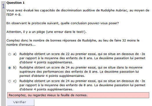 - Un entraînement créé à partir du logiciel Create, qui permet de proposer des feedbacks immédiats pour chaque réponse donnée, qu'elle soit correcte ou incorrecte. Les étudiants peuvent repasser les questions autant de fois qu'ils le désirent. Ces questions peuvent être de formes différentes : QCM, questions à réponses multiples, appariement, texte à trous, etc.