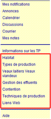 Le menu du cours permet de structurer le cours et sa navigation. Un onglet de menu est consacré à chacun des 6 thèmes abordés dans le cours. Pour voir ce que l'enseignant met à la disposition de l'étudiant sur un thème donné, il suffit à ce dernier de cliquer dans le thème correspondant dans le menu.
