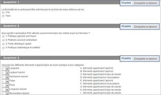 Chaque thème contient, en plus du module théorique, une évaluation sous forme de QCM. Les évaluations ont une vingtaine de questions de formes différentes : question à choix ou réponses multiples, appariement, vrai/faux, etc. L'objectif est de permettre aux étudiants de tester leur connaissance sur le thème et de retourner dans le module théorique au besoin.